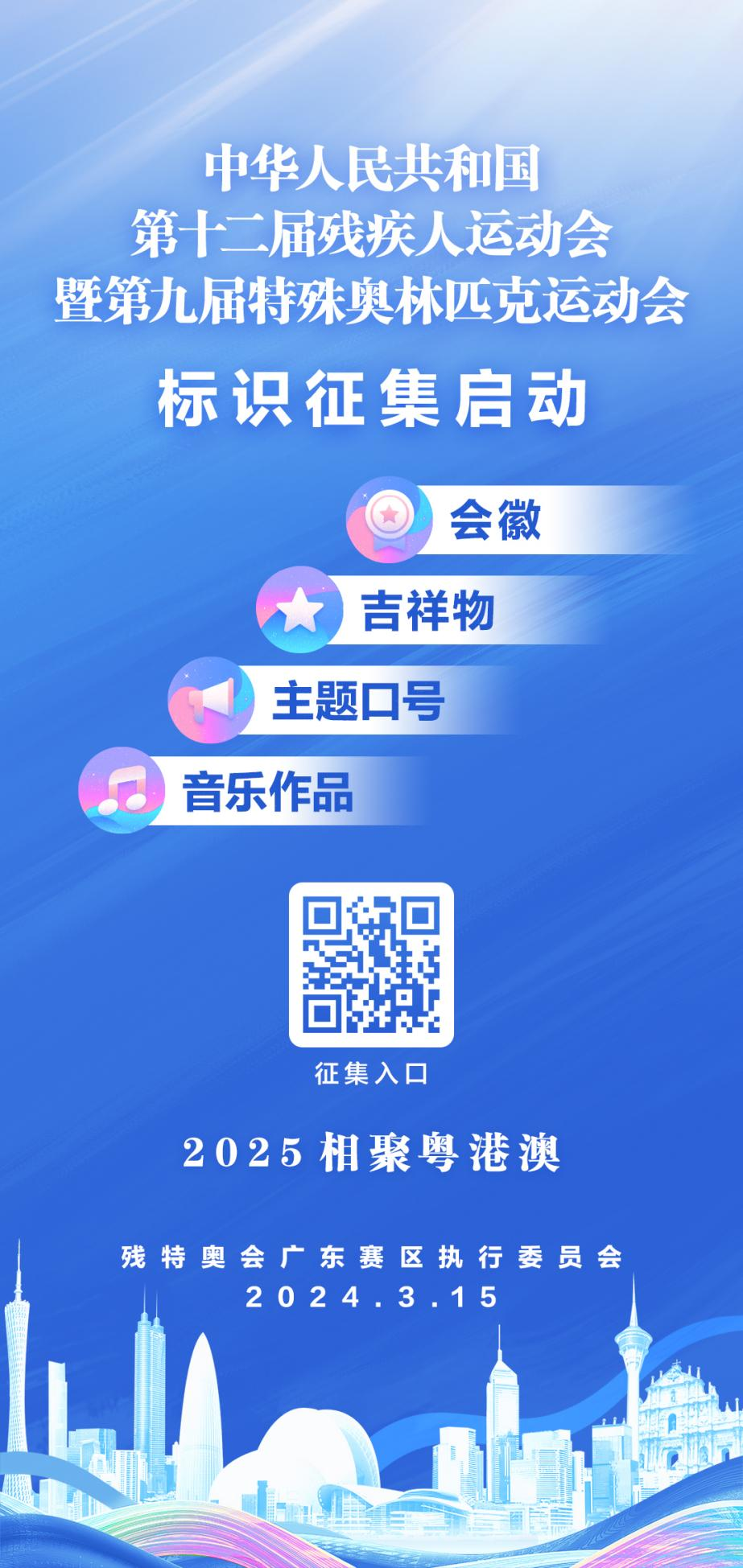 为办好本届运动会,传递这一体育盛会所蕴含的精神内涵,3月15日,经中国残联授权,全国第十二届残疾人运动会暨第九届特殊奥林匹克运动会广东赛区执行委员会(以下简称残特奥会省执委会)发布《全国第十二届残疾人运动会暨第九届特殊奥林匹克运动会会徽、吉祥物、主题口号、音乐作品征集公告》,面向全球征集残特奥会会徽、吉祥物设计方案,主题口号及音乐作品。