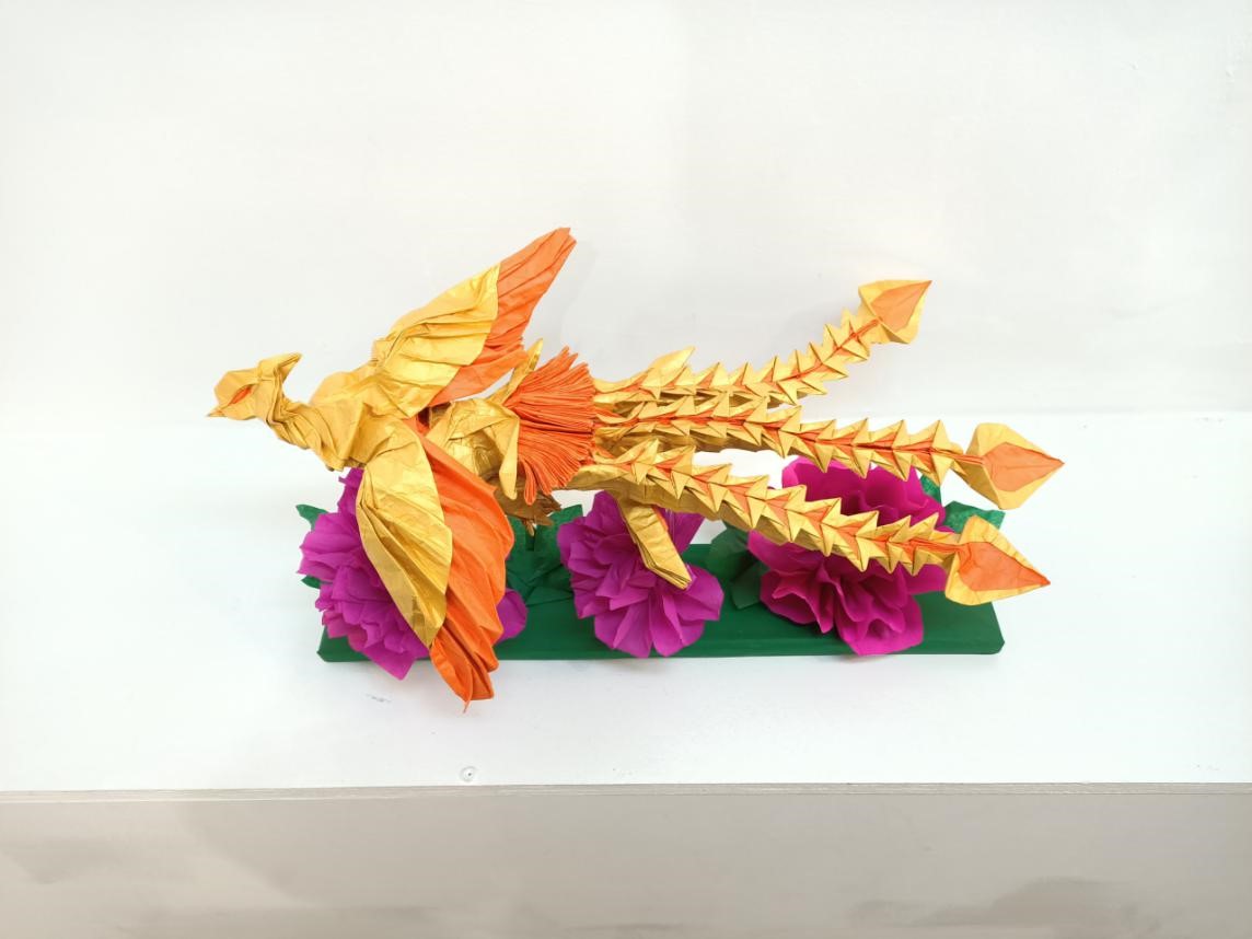 黄晓娴耗时数年设计龙凤,龙的折叠步骤教程已发表于今年1月由江苏凤凰少年儿童出版社出版的她个人作品集《中国风折纸》上。此前折纸中国龙曾在今年2月的法国大皇宫艺术展展出,获得好评。之后一个月,她继续打磨凤凰,携最新版本亮相卢浮宫卡鲁塞尔厅艺术展,收获大奖。