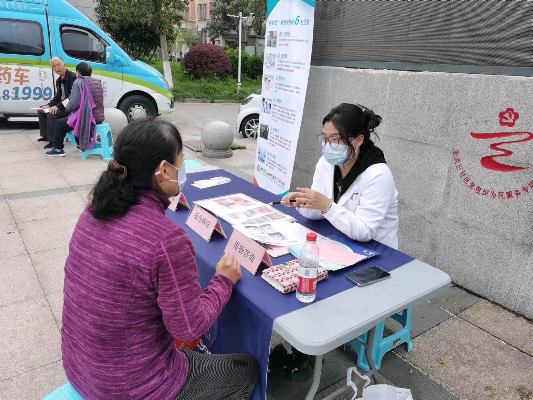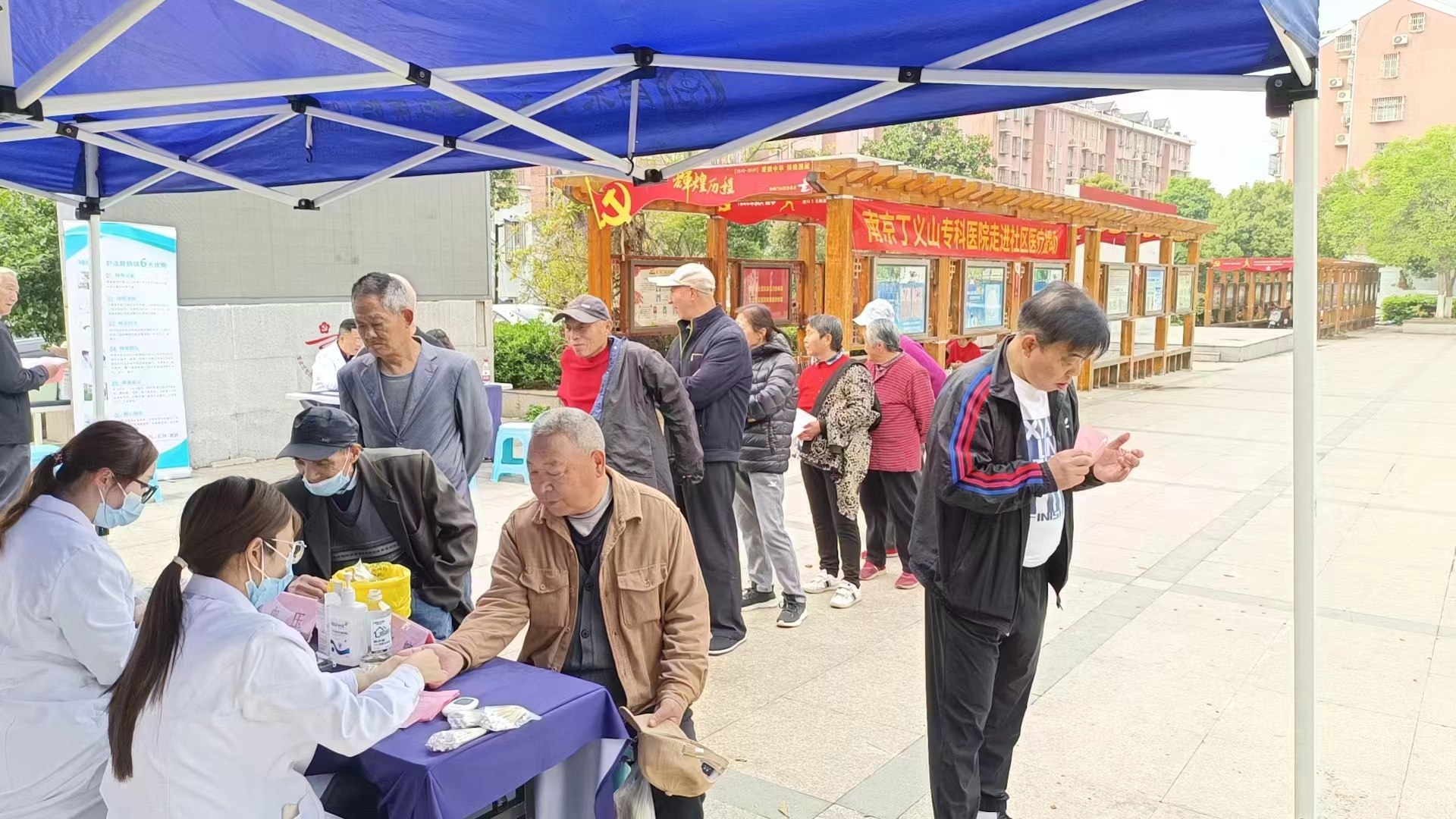 活动现场,南京丁义山肛肠专科医院的医护人员为居民提供胃肠道问题咨询及测血糖、量血压等服务。