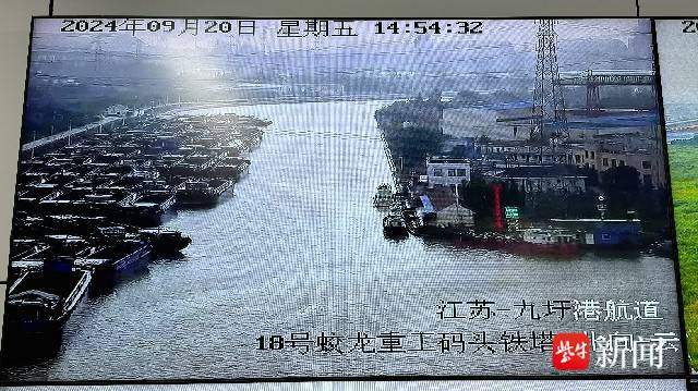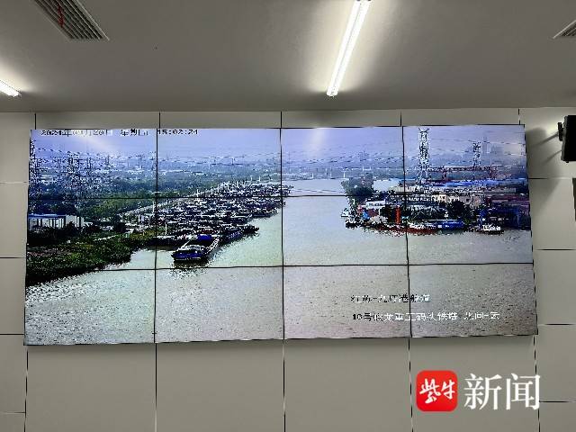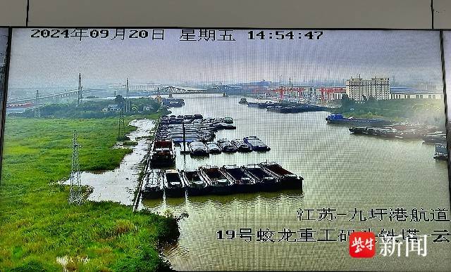 从监控屏幕中可以清晰地看到,在九圩港航道蛟龙重工码头区域,数十艘驳船整齐有序地紧密相连,稳稳地锚泊在航道边。码头和船上均无悬挂物,一切都显得井然有序。通吕码头区域,大小船舶密密麻麻地几乎布满了整个水面,水面上浪花翻腾,虽然景象令人感到些许紧张,但看到各项防范措施都已落实到位,也让人心中踏实不少。