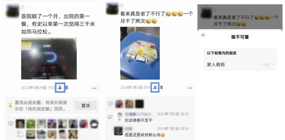 让陈瑞没有想到的是,他在留言中看到了来自妈妈的评论。以往为了不让家人担心,陈瑞发朋友圈时如有生病受伤的内容都会特意将家人屏蔽,“那天可能是因为太累了,所以忘记了屏蔽妈妈。”陈瑞平时在发“不好”的朋友圈时,都会将家里人屏蔽。