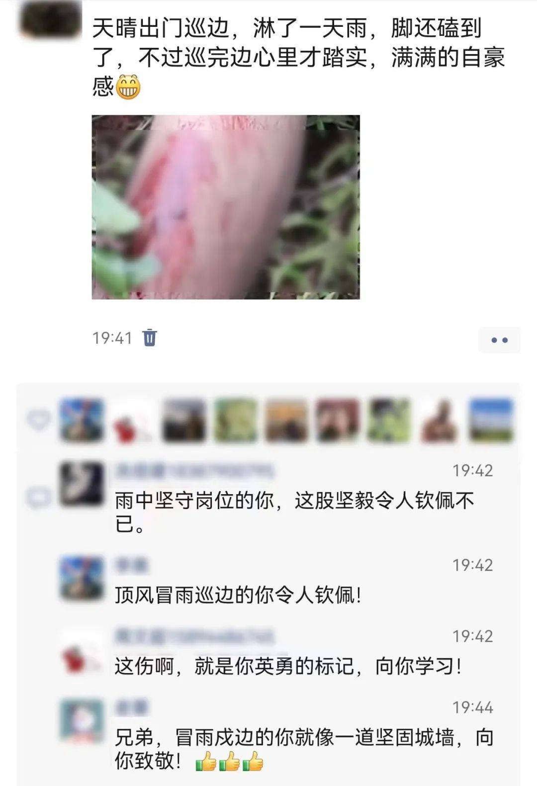 近日,27岁的云南移民管理警察陈瑞在边境巡逻中不慎受伤,他发了一条朋友圈却突然看到了妈妈的关切留言,陈瑞瞬间落泪。原来这一次他的朋友圈忘记了屏蔽妈妈。当天一早云南普洱边境管理支队力所边境派出所民警陈瑞与同事及驻地联防员像往常一样开展边境巡逻工作,刚出发时还是烈日当空,忽然大雨倾盆,队员们全身都被雨水淋透,衣服湿漉漉地贴在身上。由于山路湿滑,陈瑞不慎摔倒,小腿被石头划破了。在对伤口进行简单处理后,陈瑞和队友们沿着边境线继续徒步巡逻。他们一路穿行密林、翻越陡坡,巡边结束时已是中午。结束当天的工作回到宿舍已是晚上7点多,陈瑞疲惫不堪地躺在床上,把不慎受伤的照片发了一条朋友圈与战友共勉,战友和朋友纷纷留言,“这伤啊,就是你英勇的标记,向你学习!”“顶风冒雨巡边的你令人钦佩!”