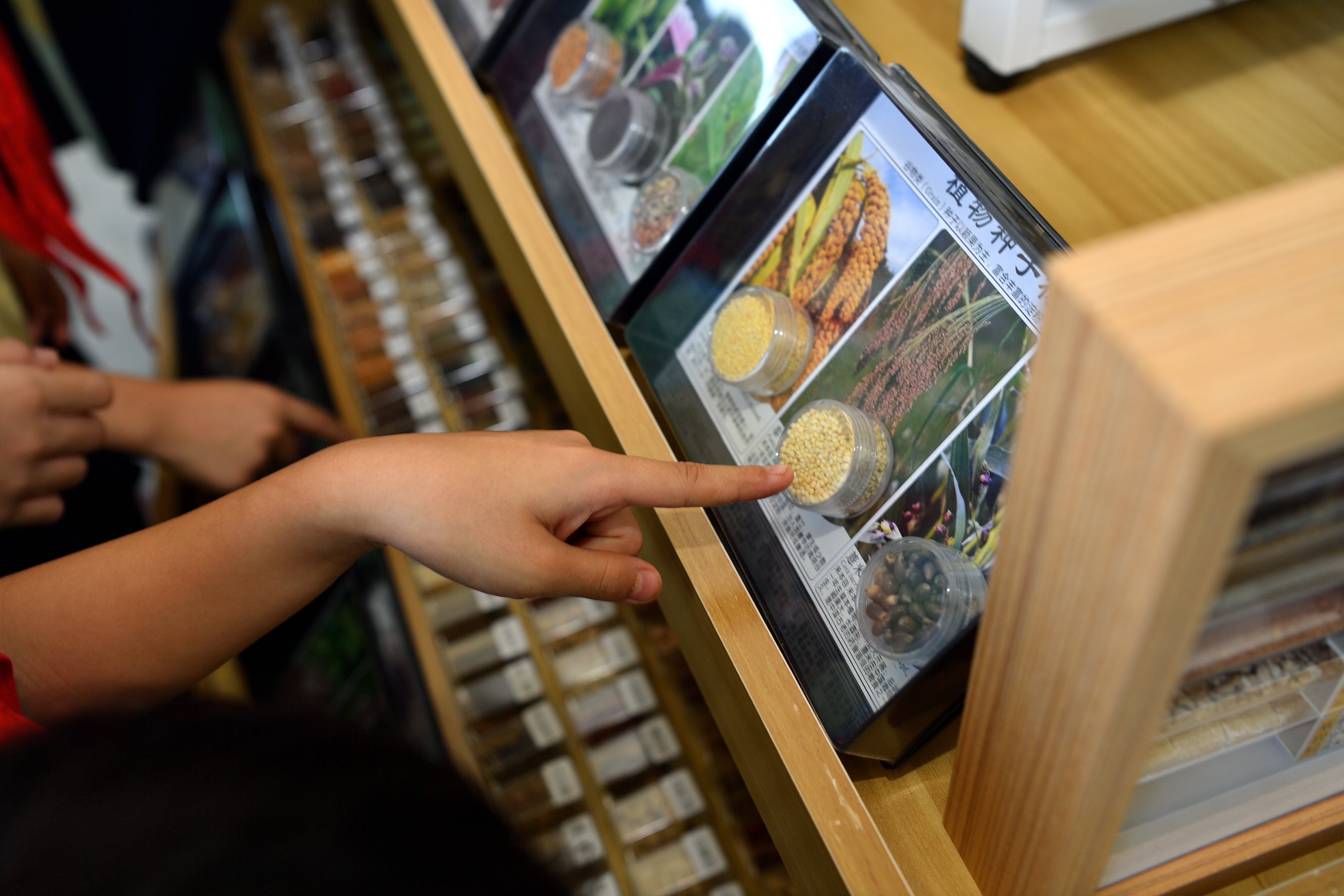 ▲农耕博物馆里展示的植物种子,孩子们好奇地一一识别。陈逸航▕摄