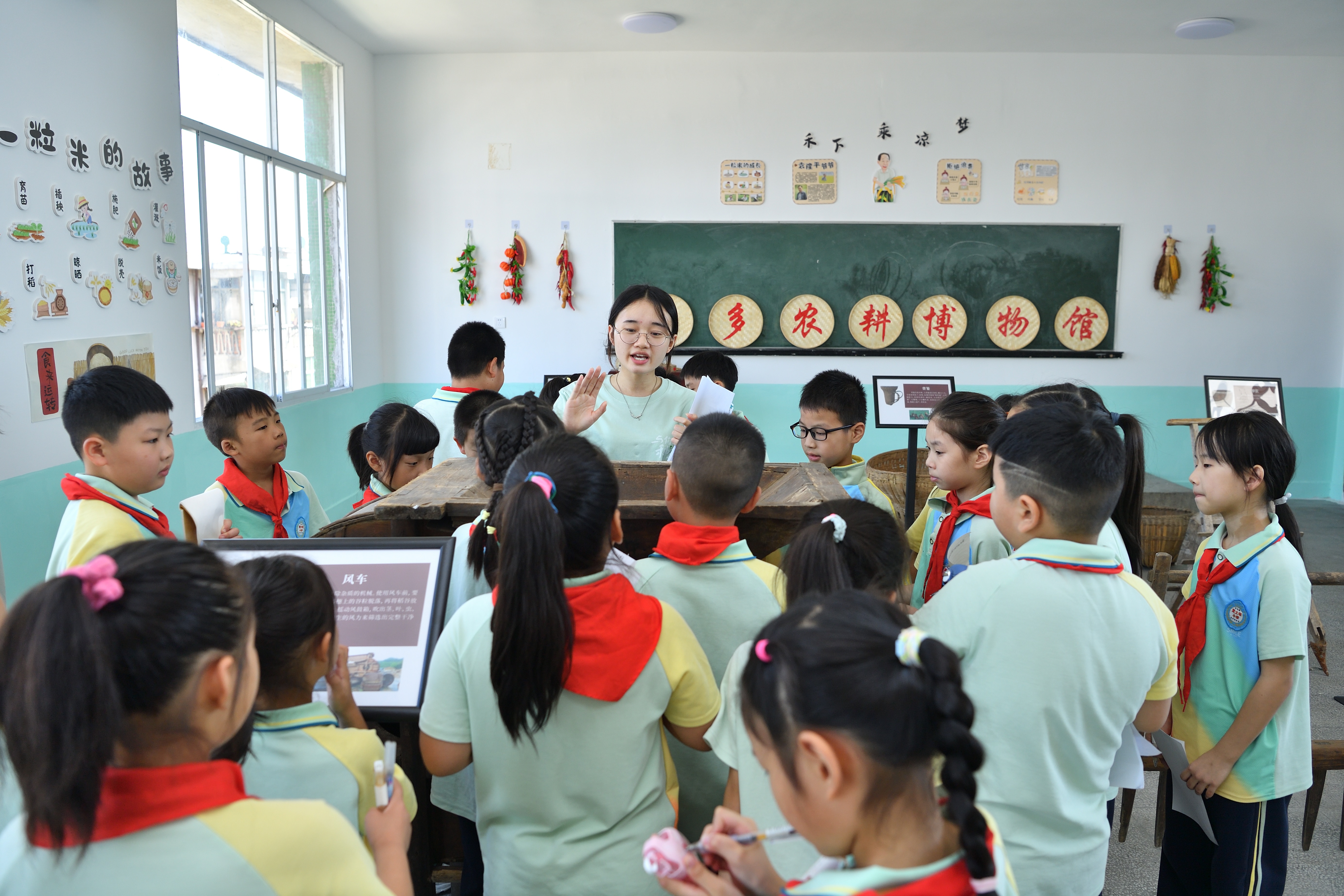 ▲在新建的多多农耕博物馆中,孩子们正在了解农耕工具。陈逸航▕摄