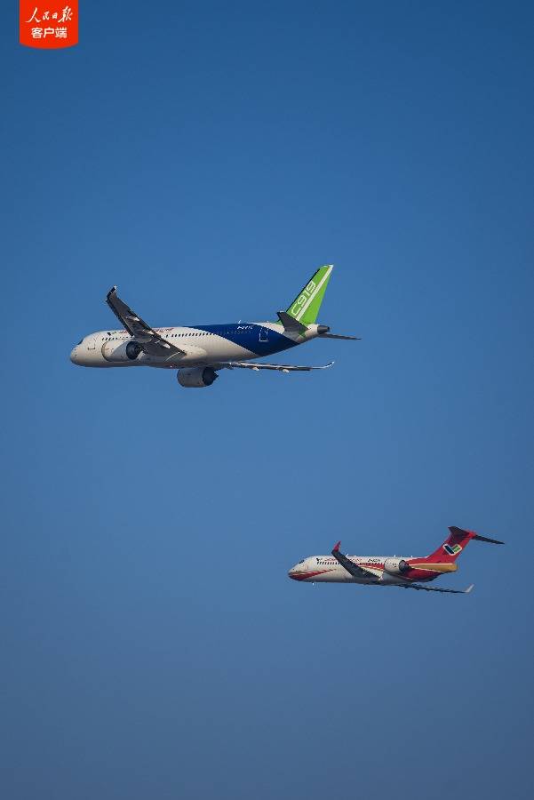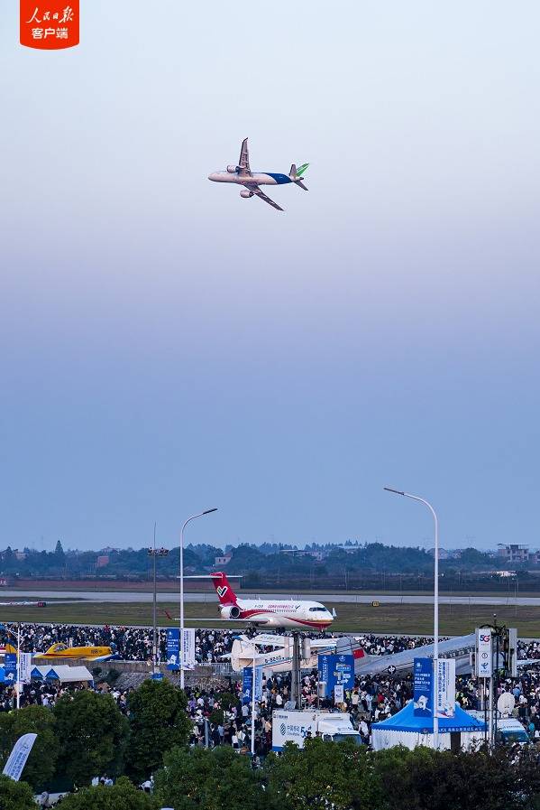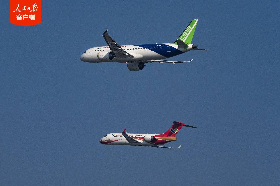 随后,ARJ21飞机先行着陆,C919飞机继续进行低空通场、大俯仰角爬升等单机飞行表演。飞行大会期间,这两架飞机还将进行地面静态展示。