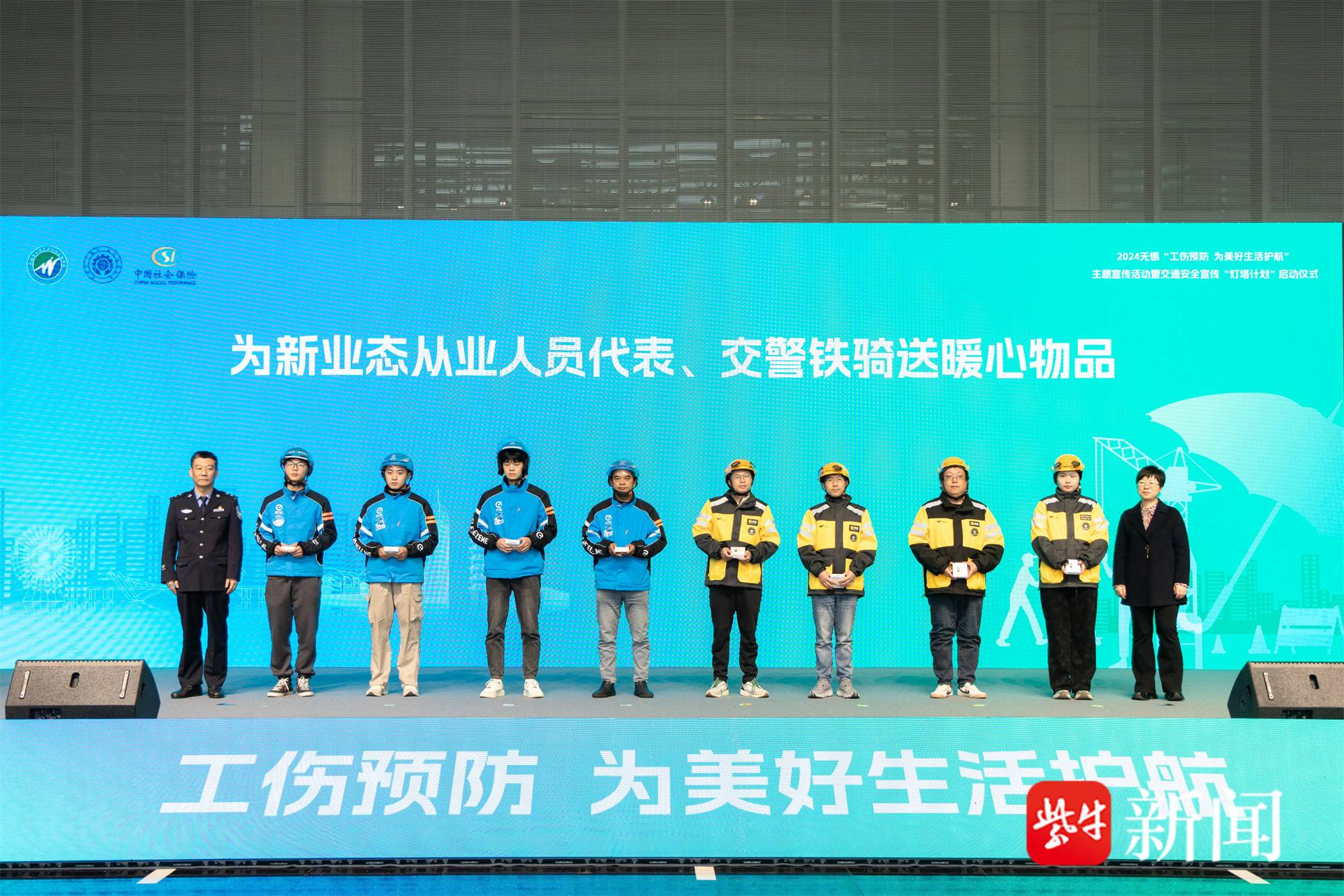 “通过本次活动,我深刻了解到工伤预防的重要性,未来我会积极响应活动号召,始终遵守交通规则,维护安全畅通的交通环境,为自己健康长久的职业生涯作出不懈努力。”一位外卖小哥作为代表,在现场向广大新业态人员发出平安倡议。随后,各级人社部门和交警的领导现场为新业态从业人员、交警铁骑赠送暖心物品,向每一位城市坚守者的辛苦与付出致以诚挚的敬意。
