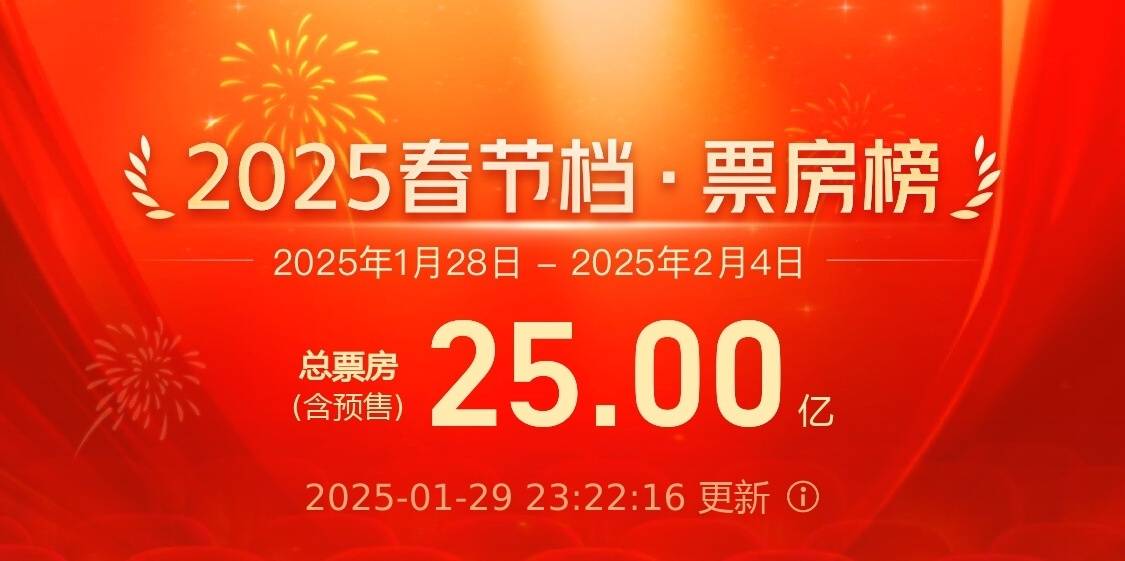 据网络平台数据,截至1月29日23时21分,2025年春节档(1月28日—2月4日)档期总票房(含预售)突破25亿!